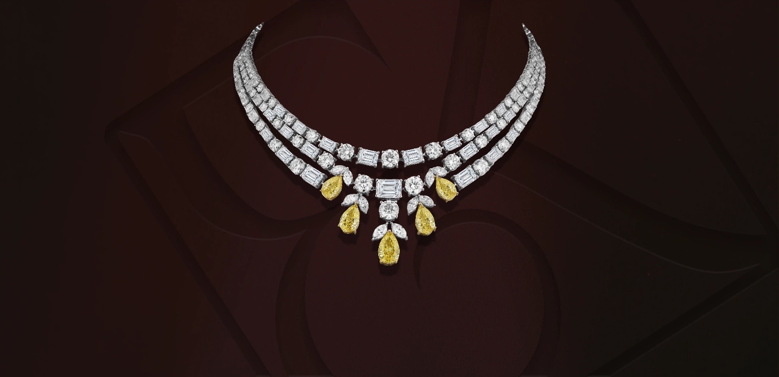 Auric Cascade Necklace- Three resplendent rows of white diamonds shimmer in symmetry, crowned by five yellow pear drops blooming from marquise leaves in regal finesse.