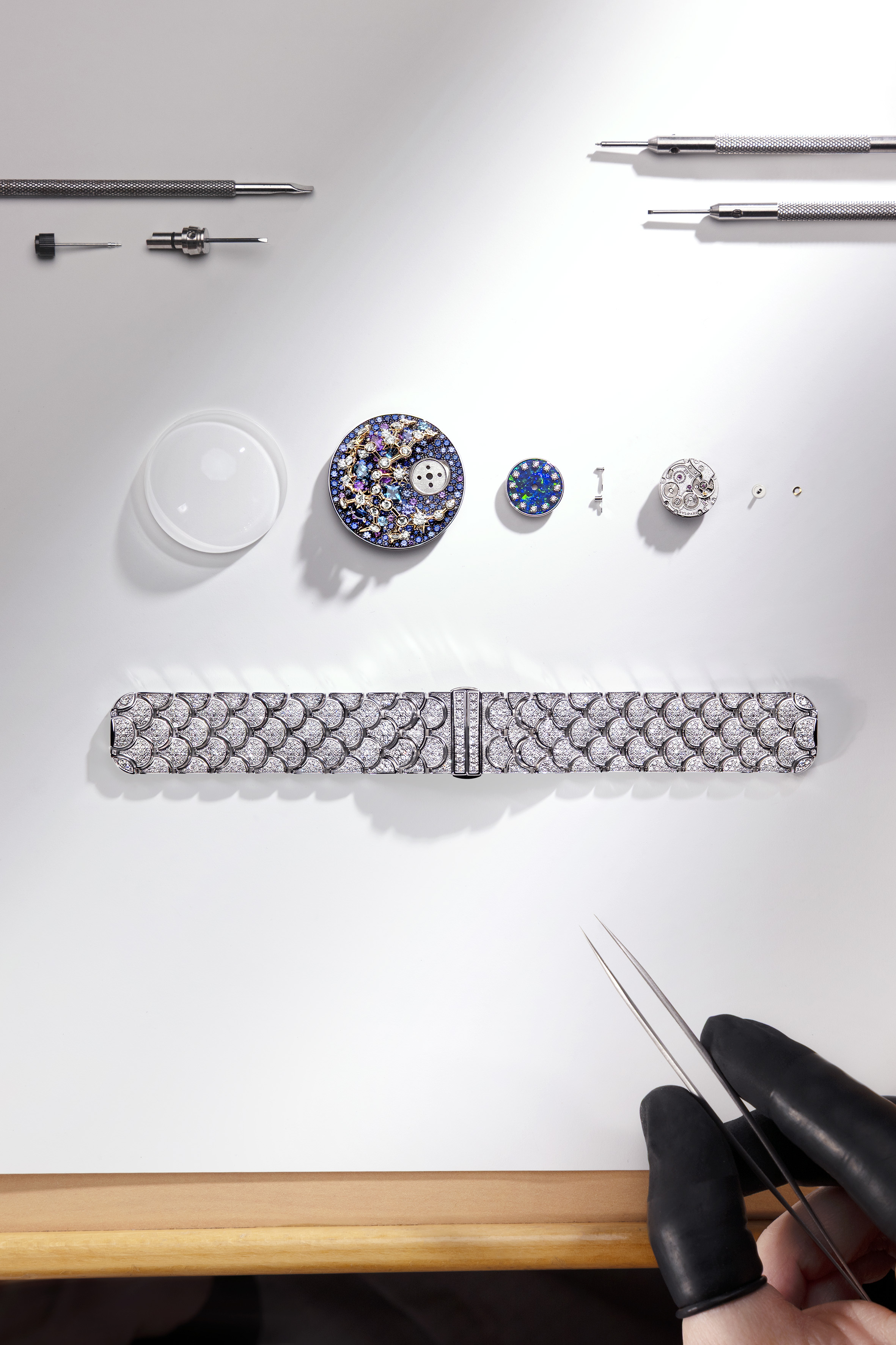 Together, these three languages merge into a unified creative method. The result is not jewellery that decorates a watch. It is not a watch set inside jewellery. It is something else entirely: a category of its own, where time is interpreted as a living form of art.