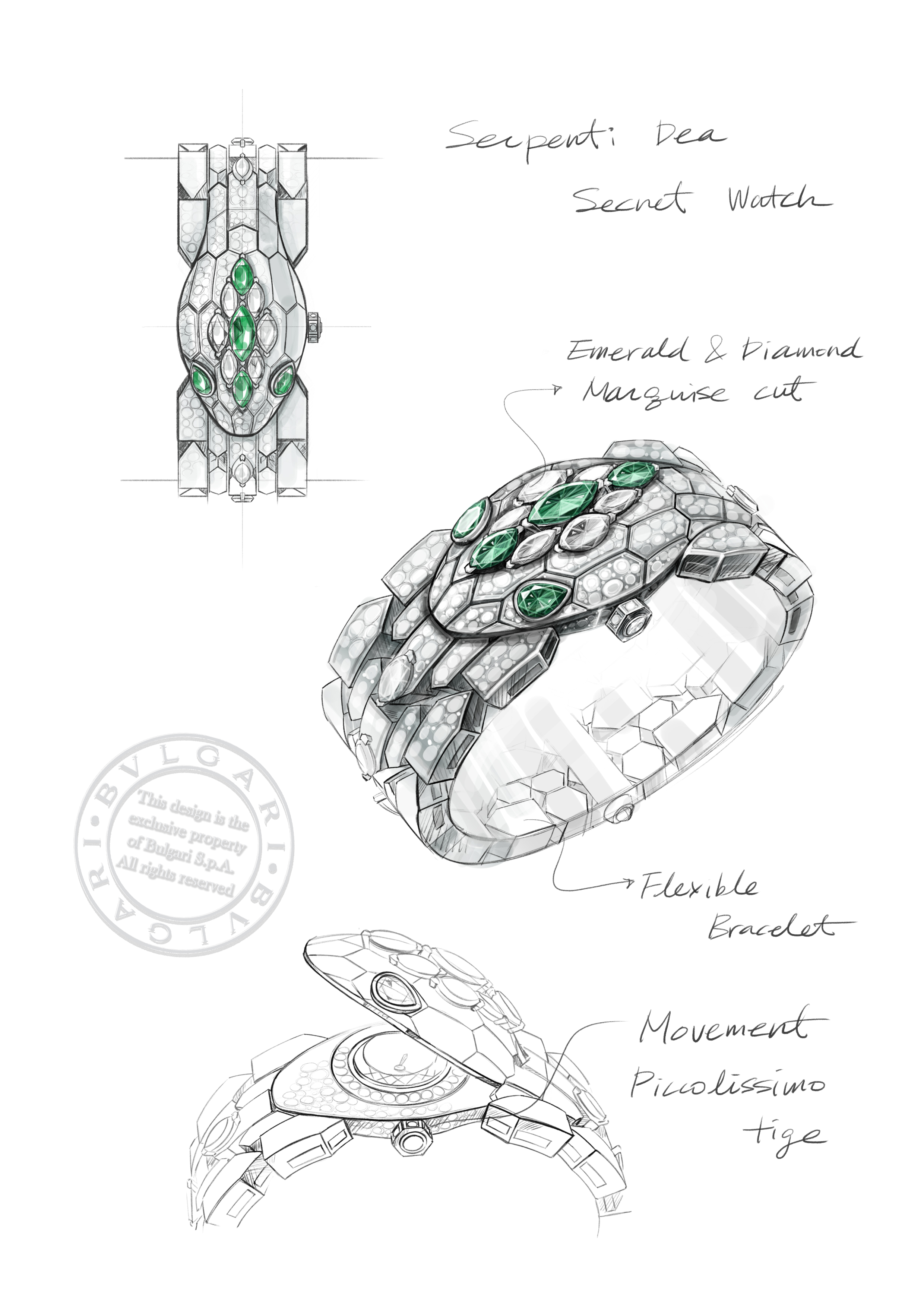 The Piccolissimo BVP 100 micro-movement within is manually wound through a crown, an expression of watchmaking savoir-faire at its most refined, housed within a piece that carries 787 round brilliant-cut diamonds, 12 navette-cut diamonds, 3 marquise-cut emeralds, and a further array of pear-shaped and cabochon-cut emeralds across its 155mm span.