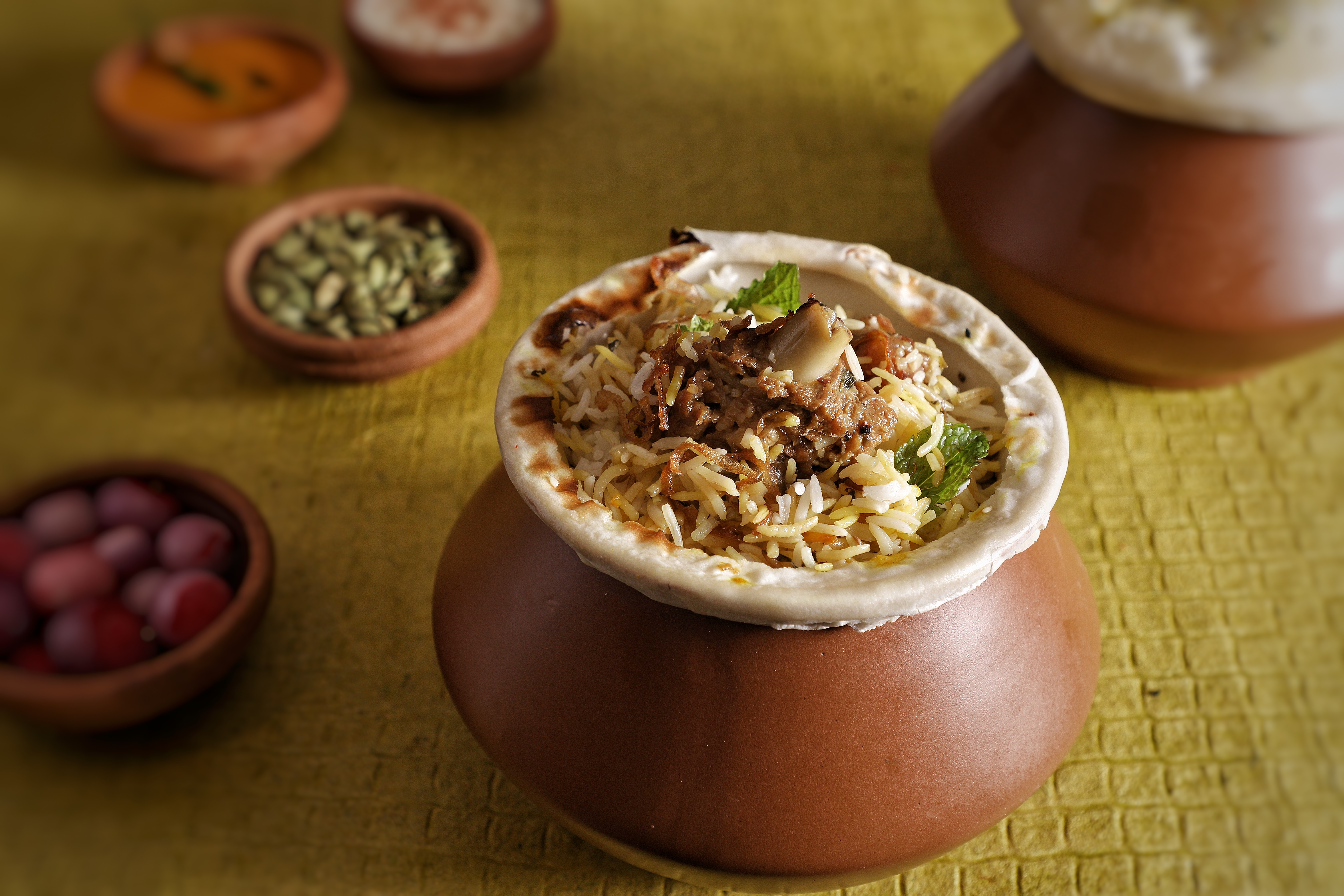 The version served at Courtyard by Marriott Bengaluru Hebbal arrives in a sealed clay handi, the dough still intact at the edges when it reaches the table. When you break that seal, the steam carries saffron, whole spices, and slow-cooked mutton into the air. It is, without exaggeration, one of the most comforting things you can experience in Bengaluru on a weekend afternoon.