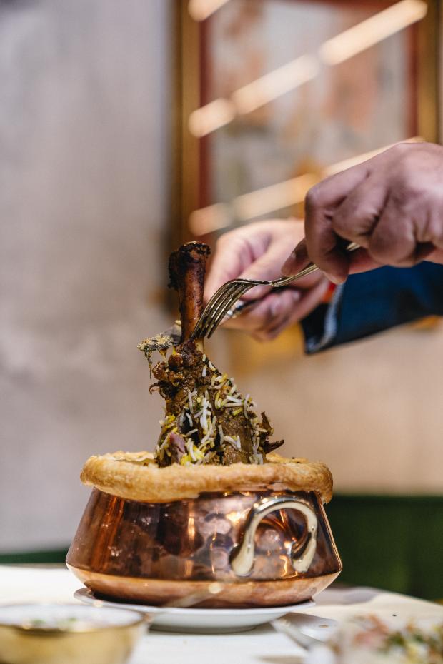 The biryani is sealed with a dough crust, baked in a clay pot with saffron, fresh plums, and lamb slow-cooked until the meat offers no resistance whatsoever. The pastry top is removed at the table. This is the drama. This is the point.