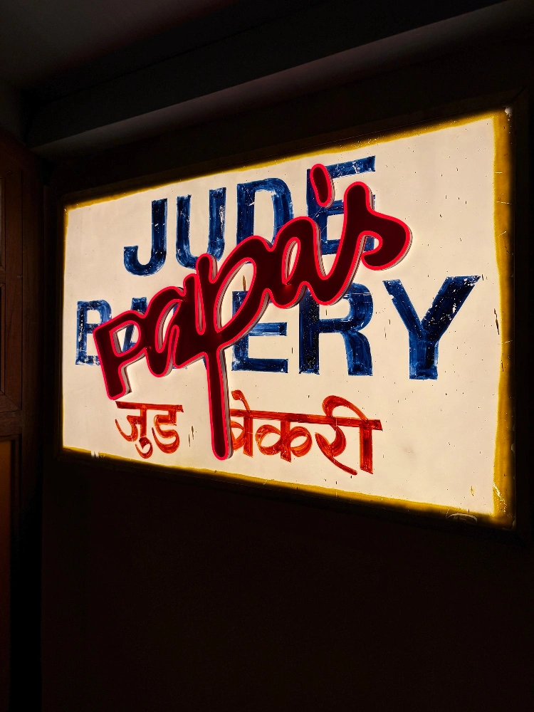 It sits above Veronica’s, Chef Hussain Shahzad’s sandwich shop on Hill Road in Bandra, in a space that was once Jude Bakery. The original signboard is still there, with Papa’s scrawled across it in a nod to what came before. You climb a flight of stairs, and you arrive somewhere that feels less like a restaurant and more like a very good dinner party in a 1980s Bandra home. Warm wood tones. Vintage knick-knacks. Art Deco memorabilia. Hand-blown lamps. A chef’s counter upcycled from the original bar top of The Bombay Canteen. Photos on the walls. Fidget spinners on the counter with messages on them. A pocketbook where guests scribble, colour, and do origami.