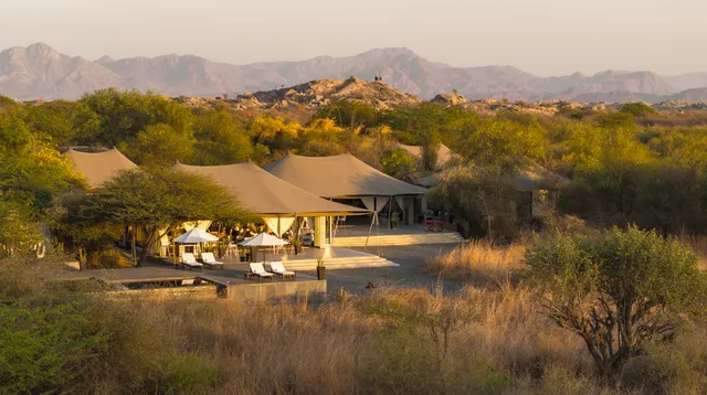 Twelve luxury tents arranged in a gentle arc on the edge of the wilderness. Each one hand-stitched from cotton canvas, furnished with teak and rosewood campaign furniture that evokes the 1920s-style safari camps of British India without tipping into pastiche. Private verandahs. En suite bathrooms that have been described, with some accuracy, as a hedonist’s delight. Arboreal lanterns lit every evening along the pathways. A watering hole adjacent to the camp that draws antelope, wild boar, and birds in extraordinary numbers at dawn and dusk, and occasionally, to the particular joy of arriving guests, something considerably more significant.