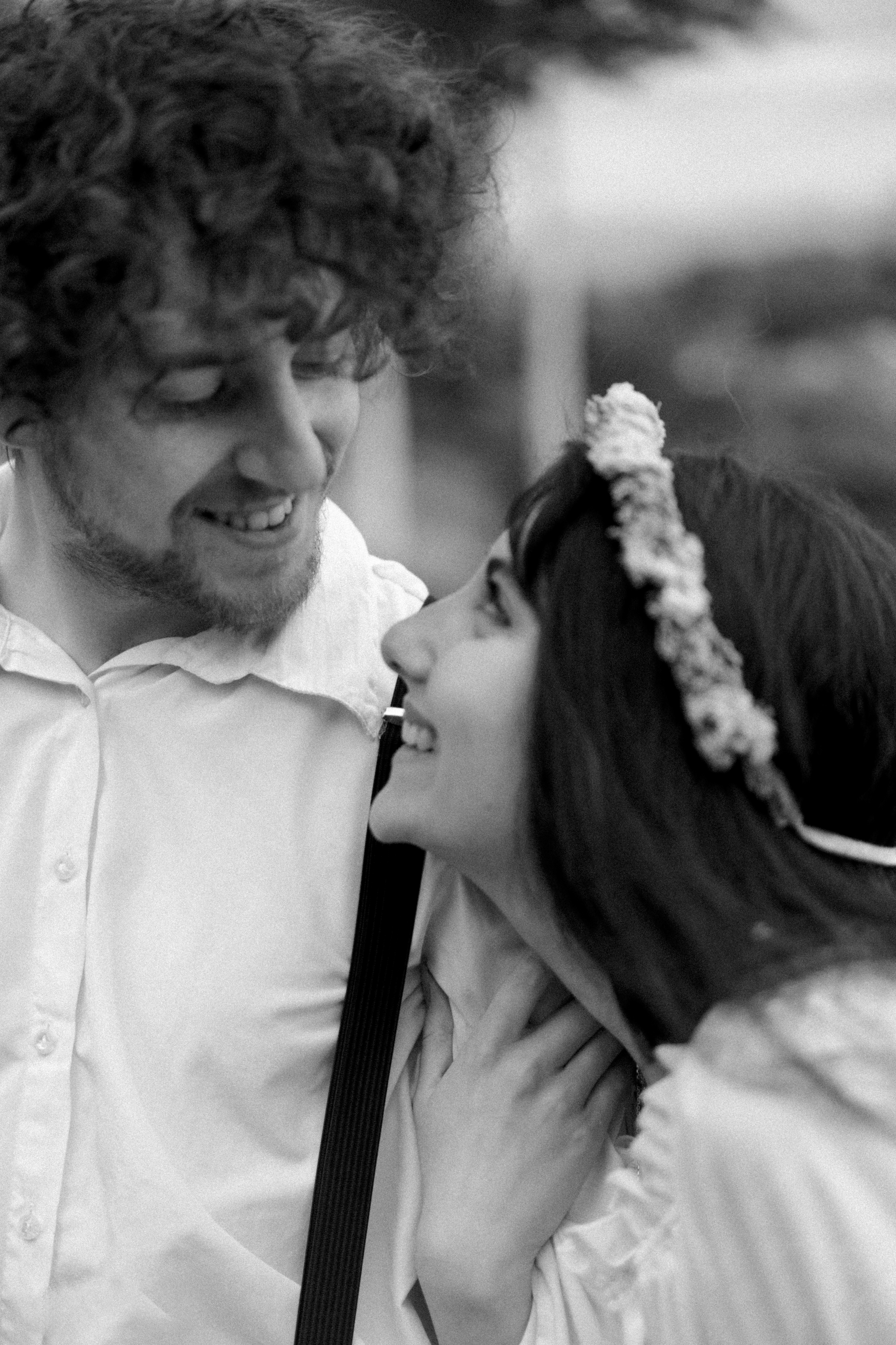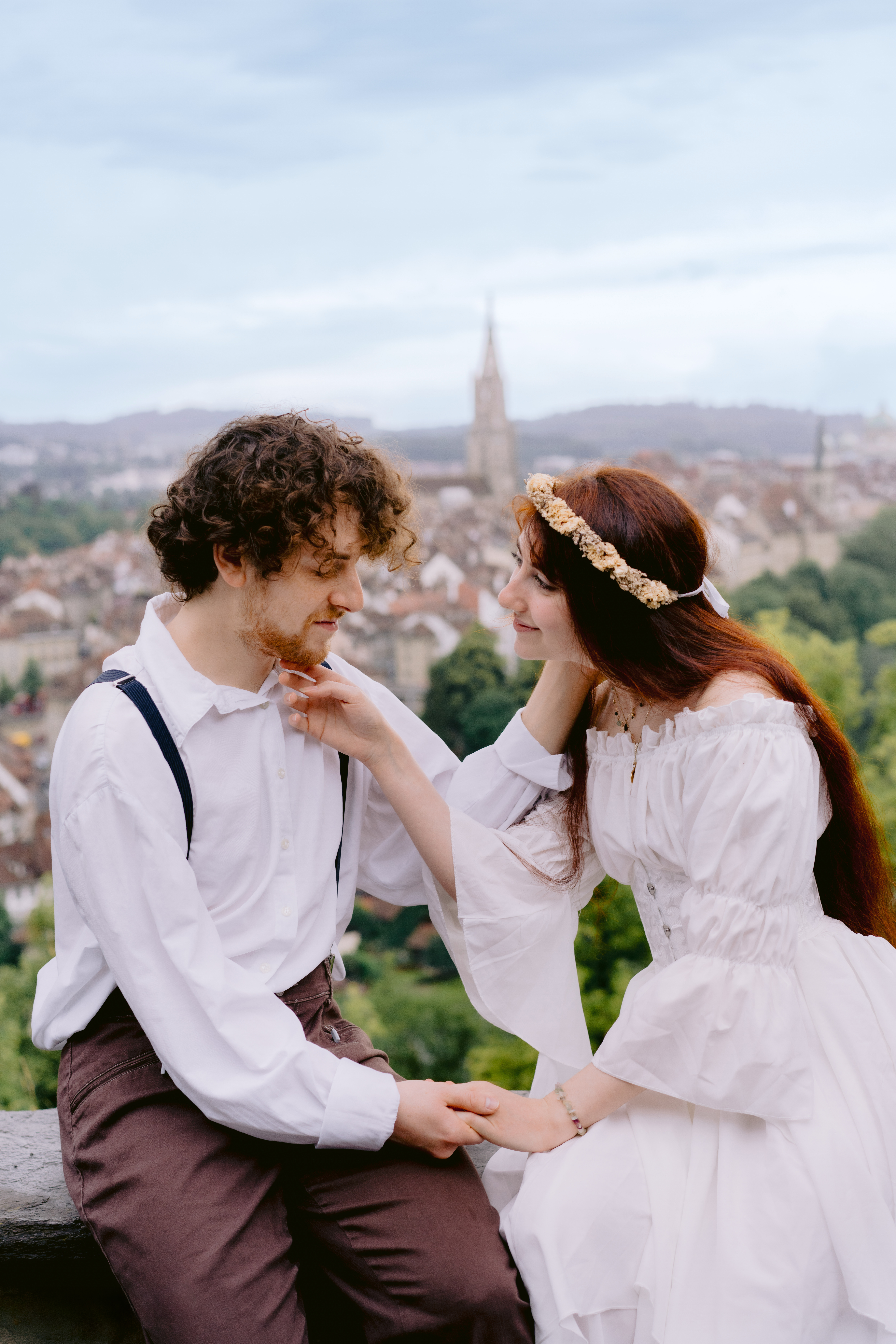 High above the city of Bern, at the Rosengarten, their pre-wedding shoot unfolded amid a burst of colour. Summer blooms surrounded them with soft pinks, wild greens, and delicate whites while the historic cityscape stretched out below. In the distance, the Bern Cathedral rose quietly, anchoring the frame with a sense of time and permanence. Nature and city met in gentle contrast, mirroring their own story of movement and grounding.